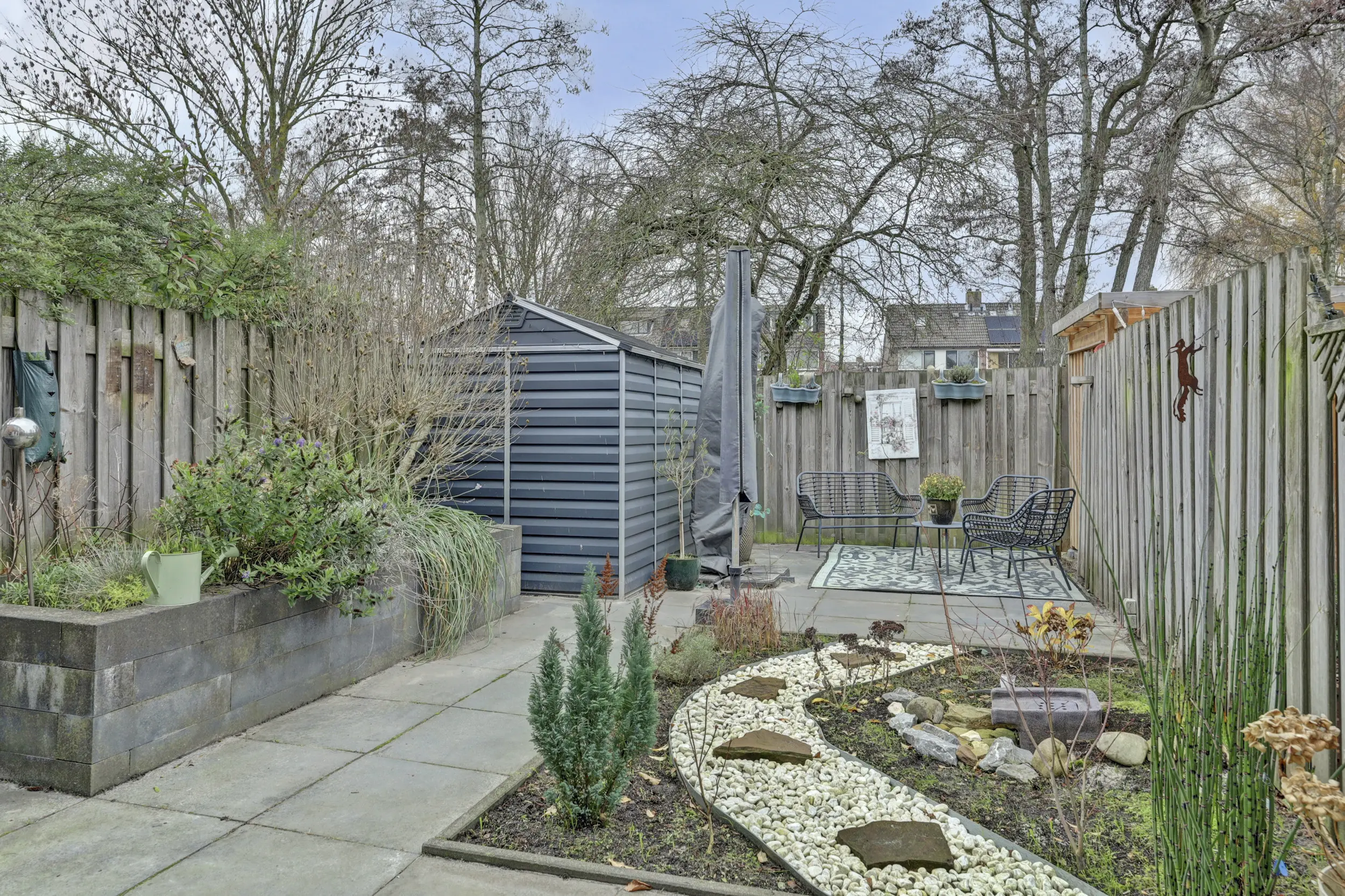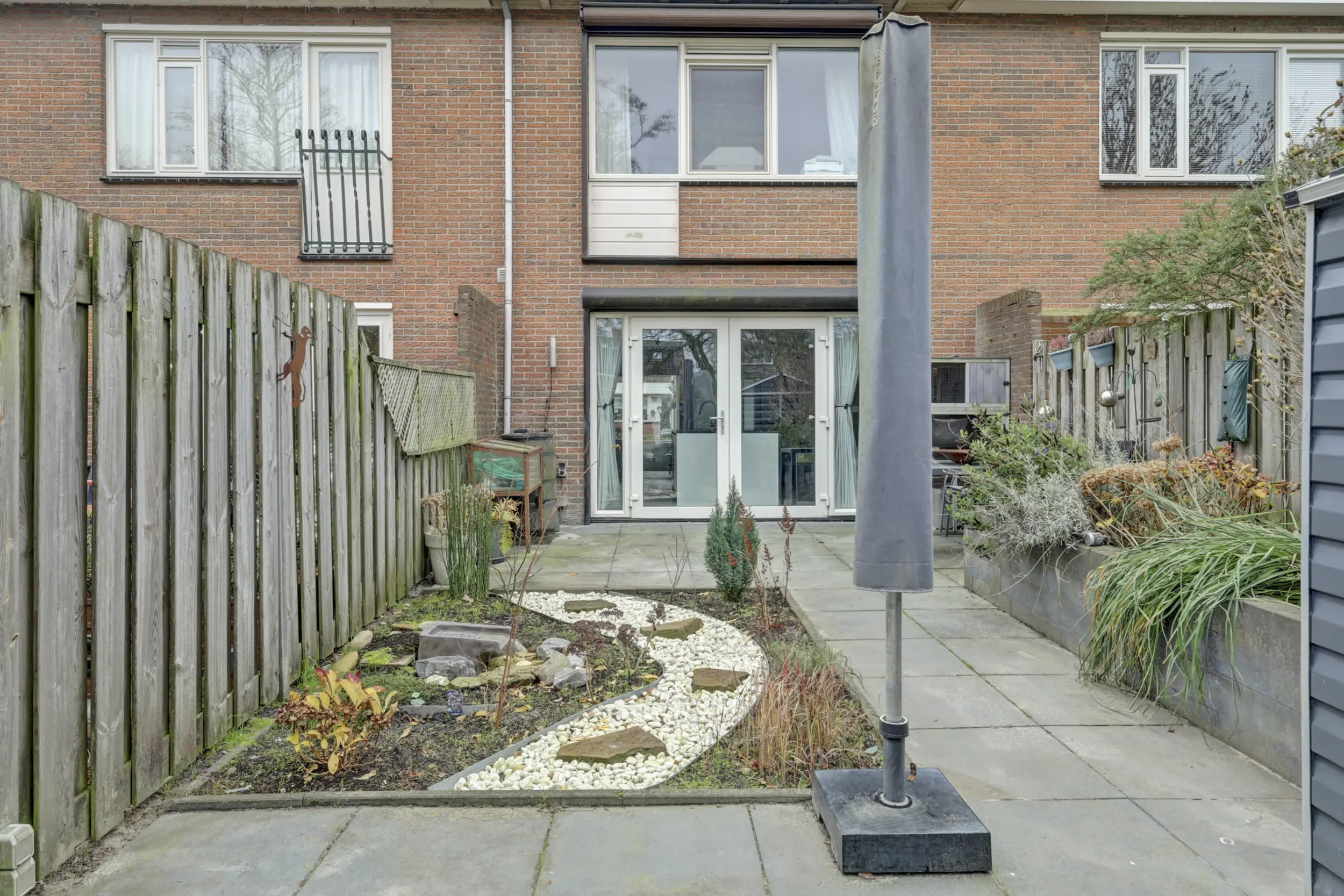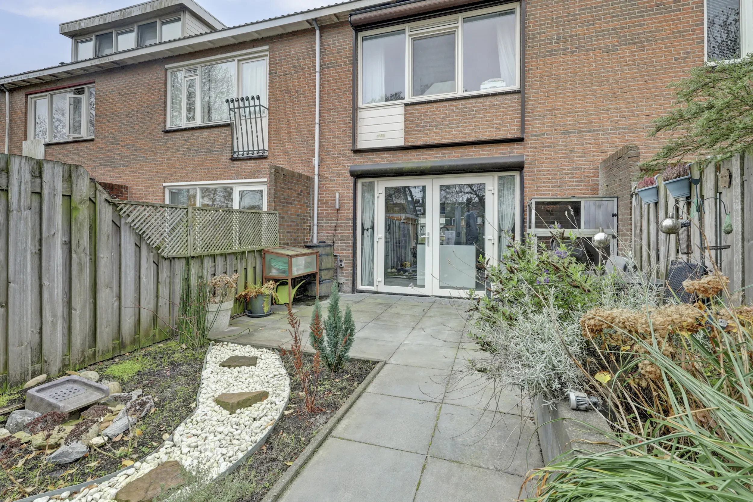 Zowel de voor,-als achtertuin is onderhoudsvriendelijk en de achterzijde beschikt over schuttingdelen, bestrating met vaste plantenbakken, berging, een buitenkraan en een achterom.
