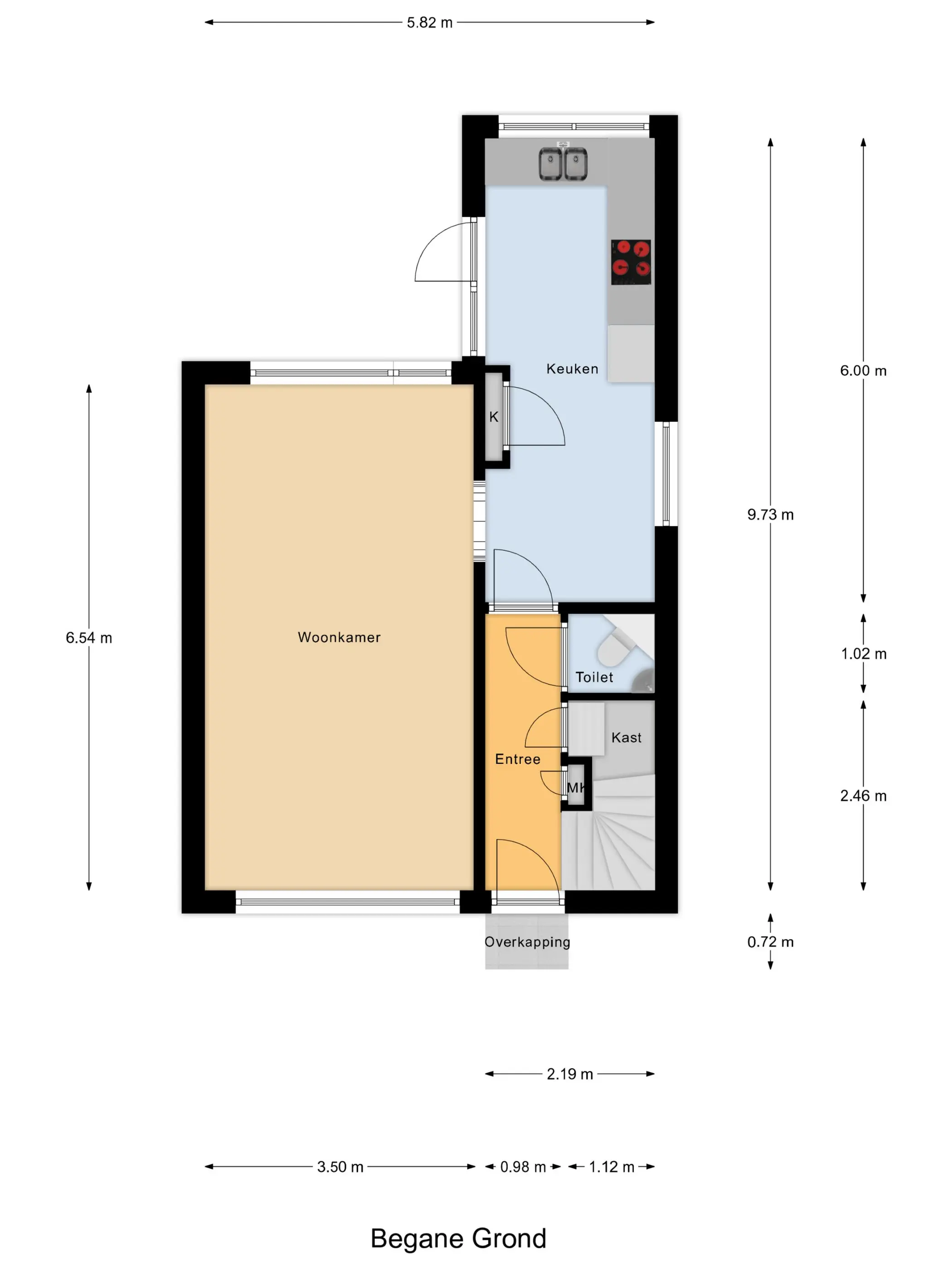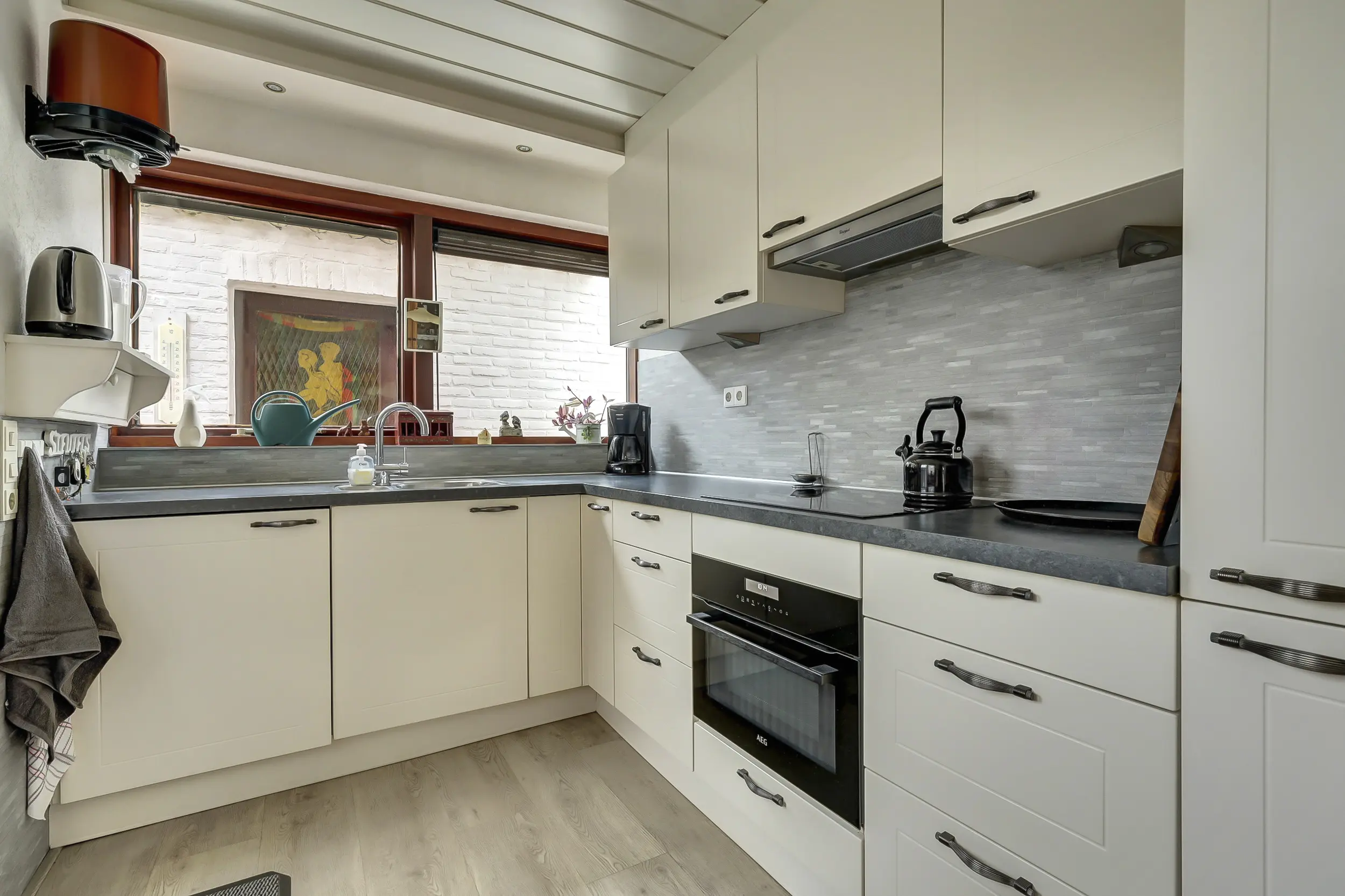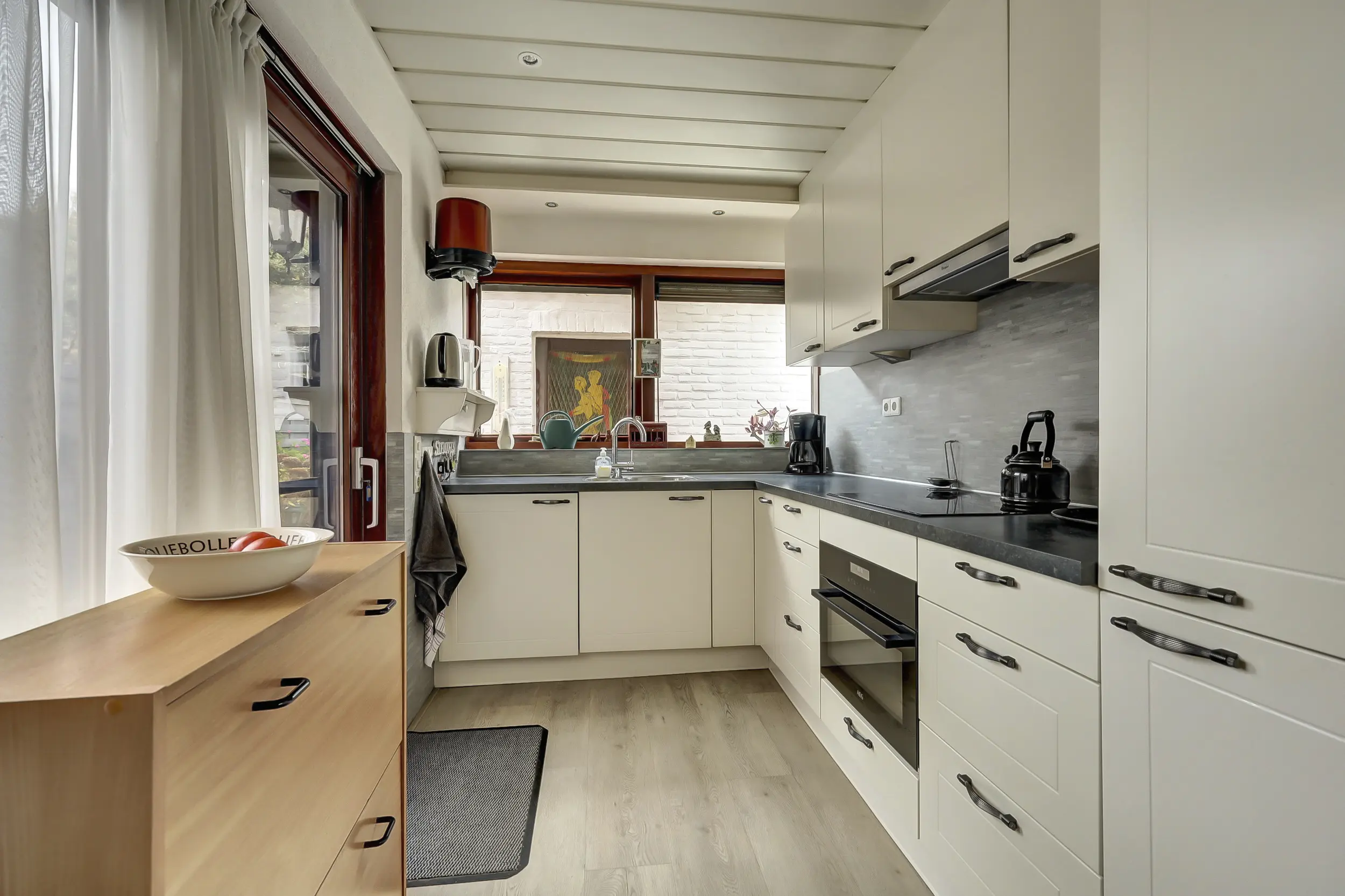 Hal/entree met de meterkast, toiletruimte en toegang naar de kelder. In de kelder bevindt zich de watermeter en de omvormer t.b.v. de zonnepanelen. Volledig betegeld toilet met wandcloset en fonteintje. Toegang naar de keuken, deze staat in en L-opstelling en beschikt over een inductiekookplaat met afzuigkap, combi-oven, koel,-vriescombinatie, close-in-boiler (10 ltr) en de aansluiting voor de wasmachine. Tevens is hier de achter entree welke voorzien is van een screen en zonnescherm. Via een toog kom je in de ruime woonkamer, deze is door grote raampartijen heerlijk licht. De gehele begane grond is afgewerkt met een laminaatvloer, de keuken, woonkamer en hal beschikken over (elektrische) vloerverwarming.