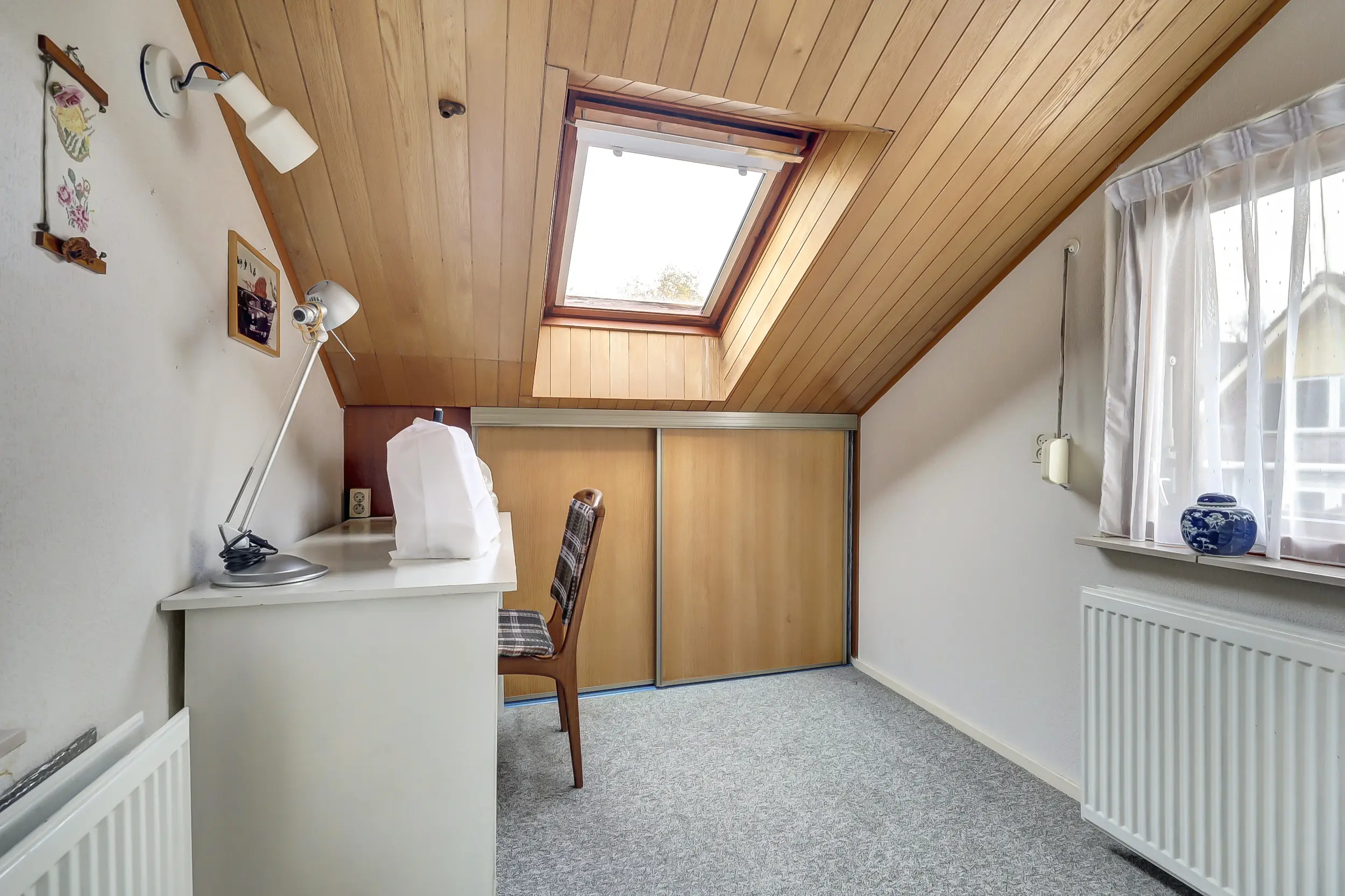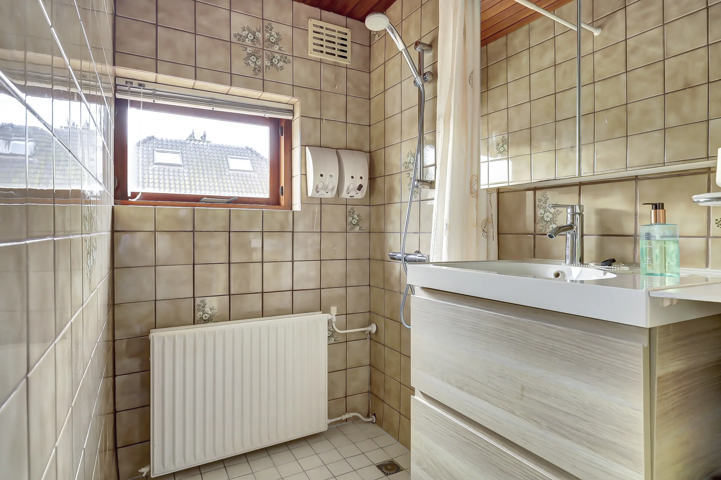 Overloopruimte met kopgevelraam en de trapopgang naar zolder. Separate toiletruimte (Sanibroyeur). Toegang naar de drie ruime slaapkamers waarvan er twee aan de achterzijde zijn gelegen. Volledig betegelde badkamer met een douche en wastafelmeubel.