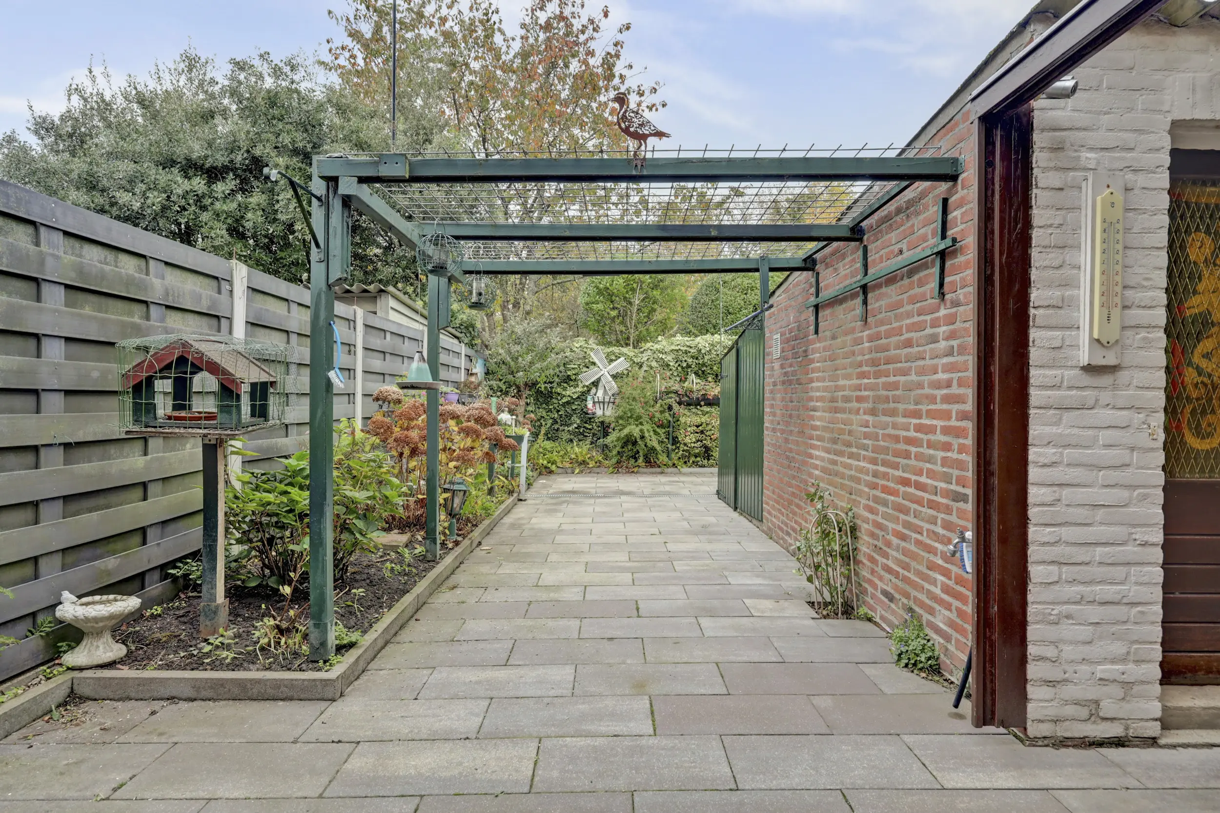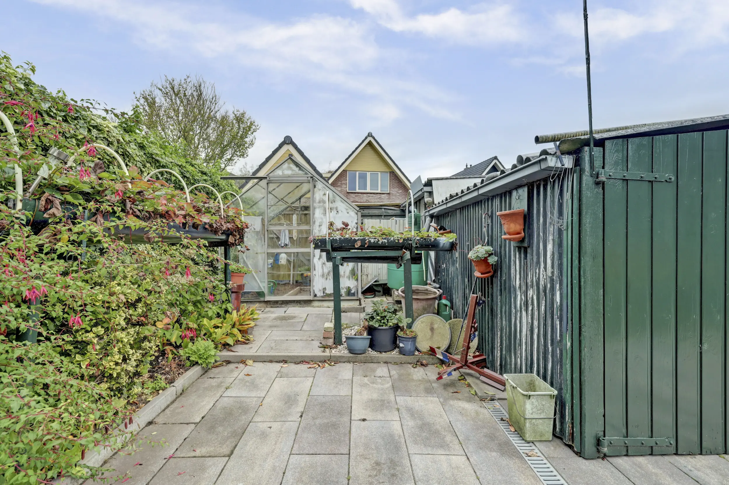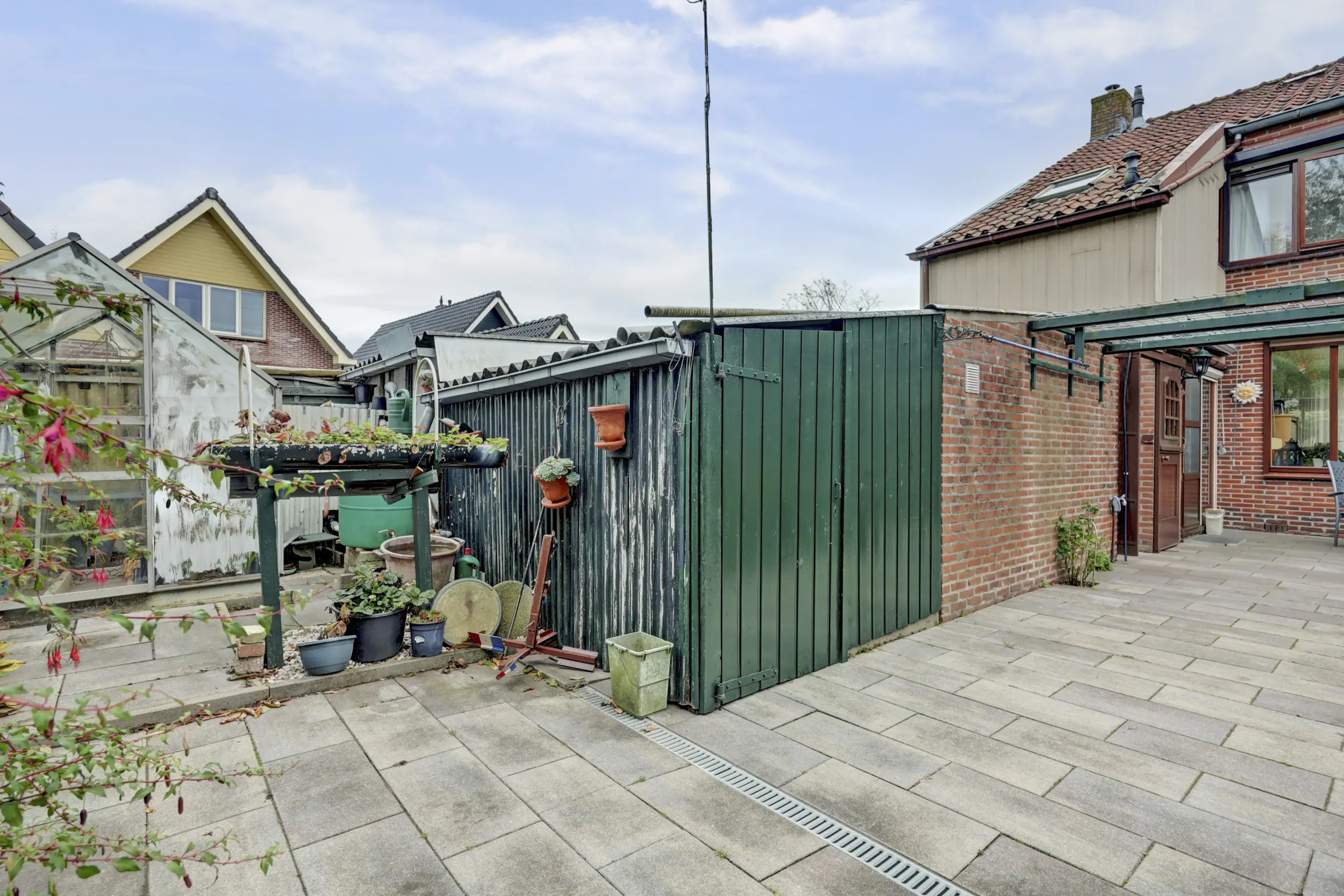 Er staan meerdere opstallen; een hobbykas, een stenen (fietsen) schuur, aangebouwde berging. Garage van betonplaten, houten berging en overkapping.